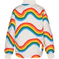 Gesteppte, beige Thermojacke aus 100 % recyceltem Polyester mit einem Allover-Print aus wellenförmigen Regenbögen. Die Jacke hat Seitentaschen, Rippbündchen an Hals und Handgelenken und einen versteckten Reißverschluss, der durch einen Windstopper mit praktischen Druckknöpfen verdeckt wird. Thermokleidung ist ideal in der Übergangszeit, wenn die Winteroberbekleidung zu warm oder die Sommerjacke zu kalt ist.