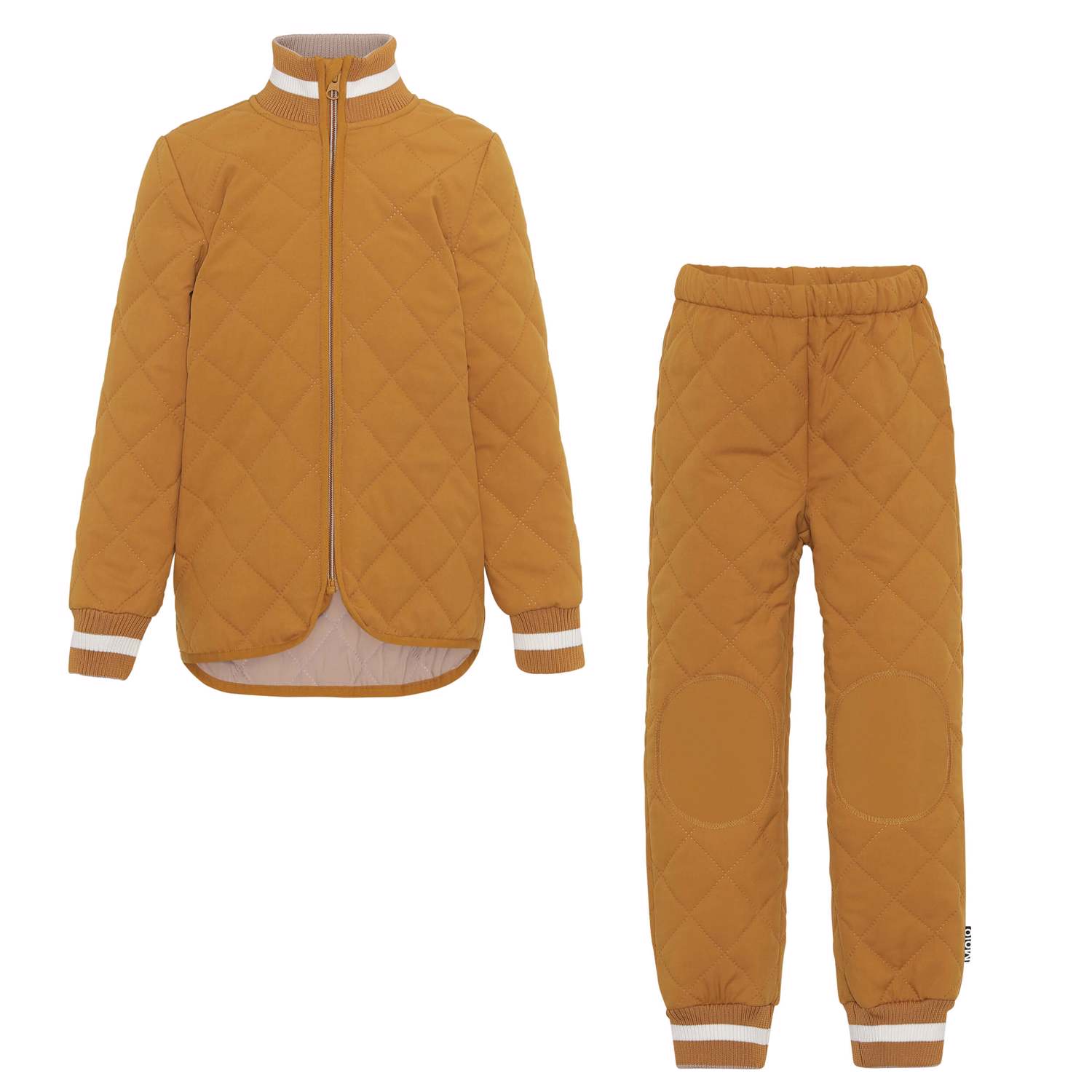 Hatton ist ein leicht isolierendes Thermoset in Goldgelb, das innen mit einer Kontrastfarbe in Nougat gestaltet ist. Die Jacke hat gerippte Kanten an Hals- und Ärmelabschlüssen und Molos ikonischem Reflexstern auf der Rückseite, der für Sichtbarkeit im Dunkeln sorgt. Die Hose hat einen Gummizug in der Taille, einen Rippabschluss an den Beinen und einen reflektierenden Stern hinten an einem Bein. Außerdem hat die Hose farblich passende Verstärkungen an den Knien und am Abschluss, was die Hose extra strapazierfähig für alle Spielarten macht.