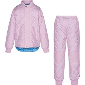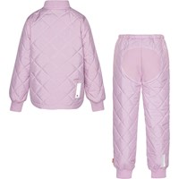 Gestepptes, violettes Thermosset aus Polyester. Die Jacke hat Seitentaschen, Rippbündchen an Hals und Handgelenken und einen versteckten Reißverschluss, der durch einen Windstopper mit praktischen Druckknöpfen verdeckt wird. Die Hose hat gerippte Kanten an den Beinen und einen verstellbaren Gummizug in der Taille.