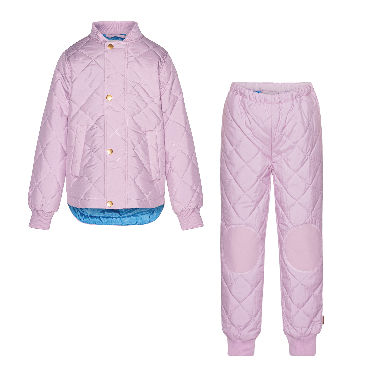 Gestepptes, violettes Thermosset aus Polyester. Die Jacke hat Seitentaschen, Rippbündchen an Hals und Handgelenken und einen versteckten Reißverschluss, der durch einen Windstopper mit praktischen Druckknöpfen verdeckt wird. Die Hose hat gerippte Kanten an den Beinen und einen verstellbaren Gummizug in der Taille.