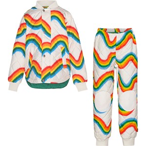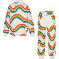 Gestepptes, beiges Thermosset aus Polyester mit einem Allover-Print aus wellenförmigen Regenbögen. Die Jacke hat Seitentaschen, Rippbündchen an Hals und Handgelenken und einen versteckten Reißverschluss, der durch einen Windstopper mit praktischen Druckknöpfen verdeckt wird. Die Hose hat gerippte Kanten an den Beinen und einen verstellbaren Gummizug in der Taille.