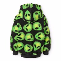 Schwarze Fleecejacke aus recyceltem Polyester mit neon-grünen Alien-Gesichtern. Die Jacke ist übergroß, hat einen praktischen Reißverschluss, passende gerippte Abschlüsse und Vordertaschen. Die Jacke hat ein weiches und glattes Baumwollfutter, das sie angenehm zu tragen macht.