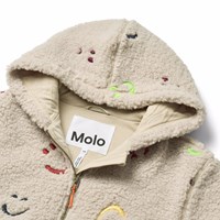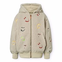 Beige Fleecejacke aus recyceltem Polyester mit bestickten bunten lächelnden Gesichtern. Die Jacke ist übergroß, hat einen praktischen Reißverschluss, passende gerippte Abschlüsse und Vordertaschen. Die Jacke hat ein weiches und glattes Baumwollfutter, was sie angenehm zu tragen macht.