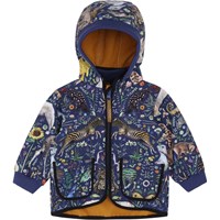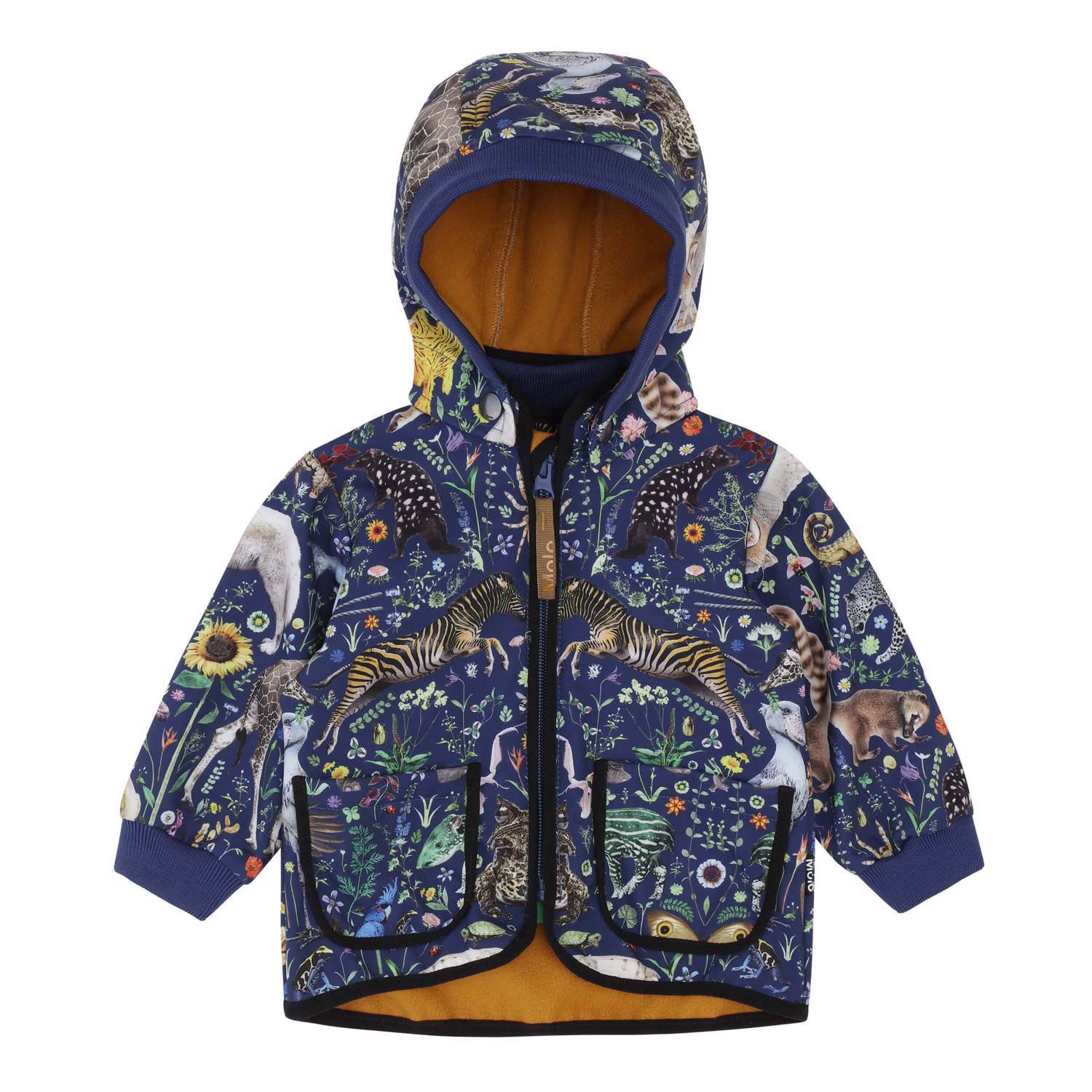 Hide ist eine funktionelle und weiche Softshelljacke für Babys und das kleinere Kind. Die Jacke ist mit einem fantasievollen Tiere-Print und mit Kontrastfarbe auf der Innenseite gestaltet. Hide hat eine abnehmbare Kapuze, einen Reißverschluss entlang der Vorderseite, Fronttaschen, Reflektoren auf der Rückseite und Rippbündchen an Ärmeln und Kapuze. Die Softshelljacken von Molo sind eine naheliegende Wahl für den Kindergarten, da das Außenmaterial winddicht, wasserdicht und atmungsaktiv ist, während das Innenfleece aus recyceltem Polyester aus Plastikflaschen besteht. Dieses Produkt hat eine wasserabweisende PFC-freie Imprägnierung (zB enthält kein PFOS, PFOA und dergleichen). Wassersäulendruck: 8.000 mm. Atmungsaktivität: 5.000 g / m2 / 24h. Die Nähte sind nicht verklebt.