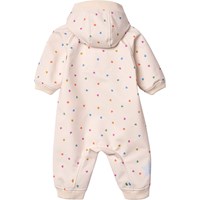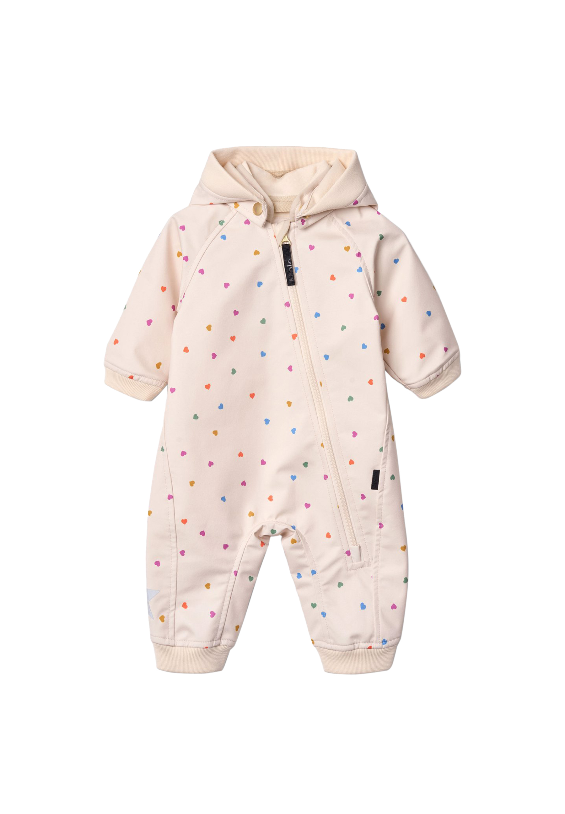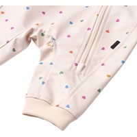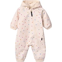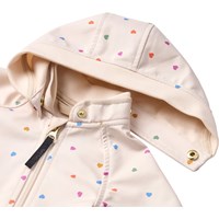 Beigefarbene, wasserabweisende Thermojacke aus recyceltem Polyester mit Steppmuster und einem Druck von kleinen Regenbögen. Die Jacke hat eine normale Passform, einen Stehkragen, Druckknöpfe vorne und passende Einfassungen, die einen schönen Abschluss bieten.