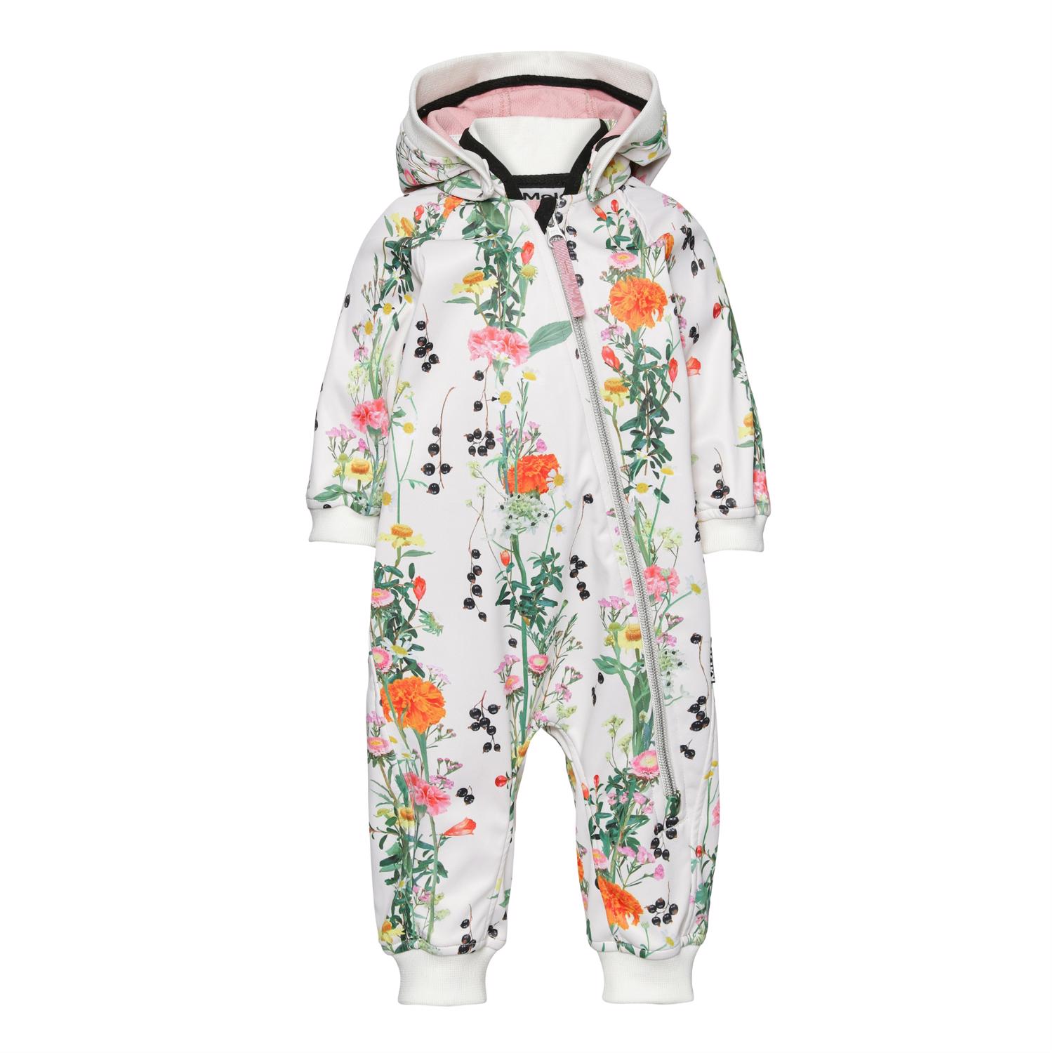 Hill ist ein Baby Softshell-Anzug in Weiß mit Drucken von vertikalen Blumenreben. Hill ist geräumig und hat einen schrägen rosa Reißverschluss, eine abnehmbare Kapuze und eine Rippe am Hals, an der Kapuzenkante, am Ärmelende und unten. Der Anzug ist gut für die Übergangszeiten, da das Material winddicht, wasserdicht und atmungsaktiv ist. Dieses Produkt hat eine wasserabweisende PFC-freie Imprägnierung (enthält zB kein PFOS, PFOA und dergleichen). Wassersäulendruck: 8.000 mm. Atmungsaktivität: 3.000 g / m2 / 24