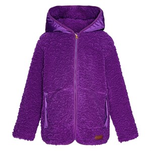 Lila Fleecejacke mit Reißverschluss vorne, einer Kapuze und großen Taschen auf der Vorderseite. Die Fleecejacke ist gut isoliert und kann daher an kalten Tagen alleine oder als zusätzliche Schicht unter Oberbekleidung getragen werden.