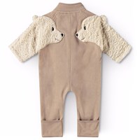 Beige und cremefarbener Fleeceanzug für Babys und Kleinkinder. Der Fleeceanzug hat einen praktischen Knopfverschluss auf der Vorderseite und niedliche Ärmel mit Eisbärenmotiv. Der Fleeceanzug hält warm und isoliert gut, sodass er alleine oder als zusätzliche Schicht unter dem Schneeanzug an den kältesten Tagen verwendet werden kann. Dieses Modell ist mit Füßen in den Größen 56-74 und ohne Füße in den Größen 80-92 erhältlich.