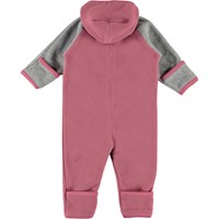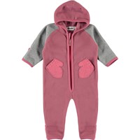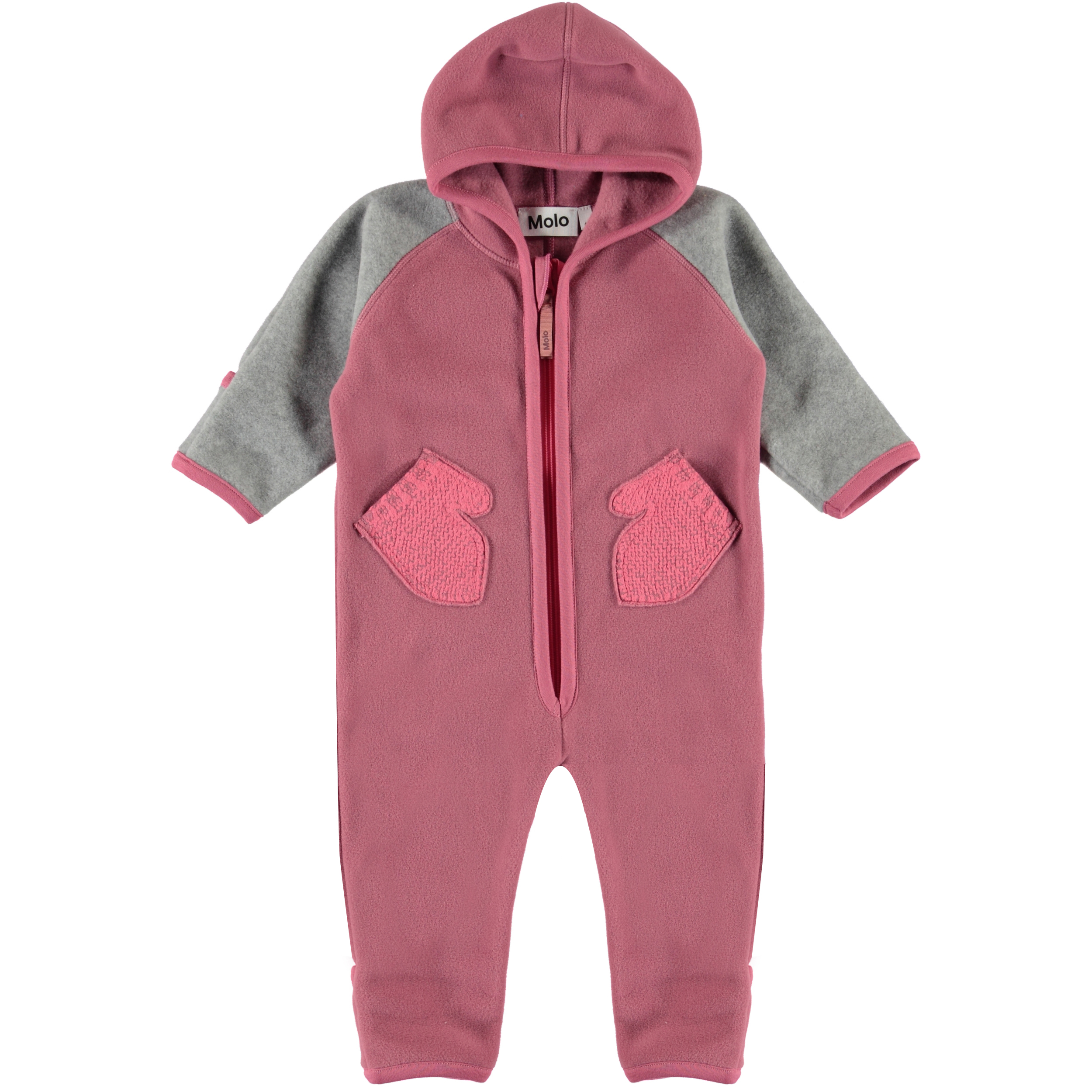 Udo ist ein Baby-Fleeceanzug in Rosa mit grauen Ärmeln und Rosa Stricktaschen, ähnlich aussehen wie kleine Handschuhe. Der Anzug hat einen Reißverschluss und eine Kapuze. Molos Fleece-Anzüge sind warm und isolierend. Verwenden Sie diese an sehr kalten Tagen alleine oder als zusätzliche Schicht unter anderen Bekleidungsstücken.