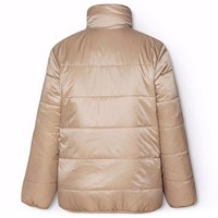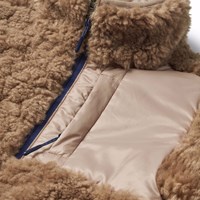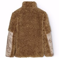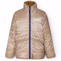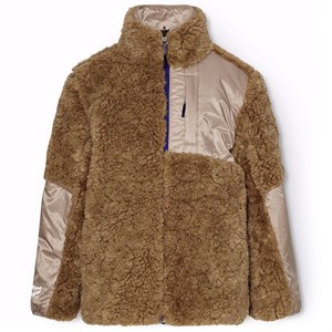 Wendbare Fleecejacke in goldenen Brauntönen. Eine Seite besteht aus weichem braunem Fleece mit leichten pinkfarbenen Details und einem Aufdruck auf einem Arm. Die Jacke hat einen hohen Kragen, einen klaren blauen Frontreißverschluss und eine Brusttasche mit Reißverschluss. Wenn die Jacke umgedreht wird, dient das weiche Fleece als Futter und Sie haben jetzt eine coole leichte rosa Windjacke. 2 Jacken in 1.