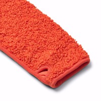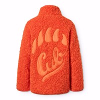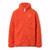 Orange Fleecejacke aus recyceltem Polyester mit einem schönen Rückenpatch aus strapazierfähigem Nylon. Die Jacke hat ein glattes Baumwollfutter, orangefarbene Rippbündchen, einen hohen Kragen, einen Reißverschluss und eine Daumenöffnung.