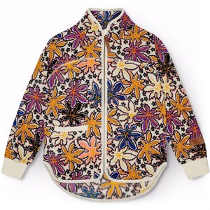Mehrfarbige Fleecejacke mit Allover-Print, Reißverschluss auf der Vorderseite, einer einzigen Seitentasche und gerippten Bündchen. Die Fleecejacke ist isoliert und kann alleine oder als zusätzliche Schicht unter Oberbekleidung an kalten Tagen getragen werden. Der mehrfarbige Druck zeigt wunderschöne Ahornblätter in verschiedenen Farben und kleine schwarze Blumen.