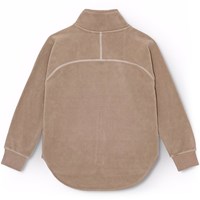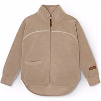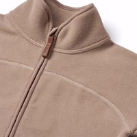 Hellbraune und grüne Fleecejacke mit blauen Details, Reißverschluss auf der Vorderseite, eine einzelne Seitentasche und gerippte Bündchen. Die Fleecejacke ist isoliert und kann an kalten Tagen entweder alleine oder als zusätzliche Schicht unter Oberbekleidung getragen werden.