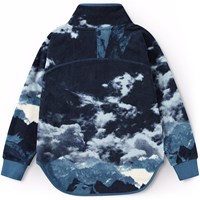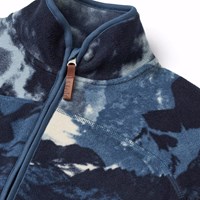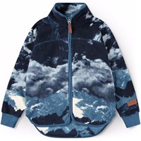 Dunkelblaue Fleecejacke mit einem Platzieringsdruck, Reißverschluss auf der Vorderseite, einer einzelnen Seitentasche und gerippten Bündchen. Die Fleecejacke ist isoliert und kann an kalten Tagen alleine oder als zusätzliche Schicht unter Oberbekleidung getragen werden. Der Druck ist eine grafische Interpretation einer Berglandschaft und des Himmels darüber.