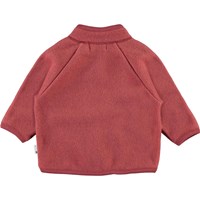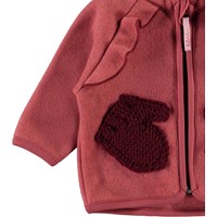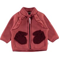 Uli ist eine Babyjacke aus rotem Polarfleece. Die Fleecejacke hat schöne gestrickte Vordertaschen, die wie kleine Handschuhe aussehen. Die Fleecejacke kann entweder alleine oder an sehr kalten Tagen als zusätzliche Schicht unter einer anderen Jacke verwendet werden