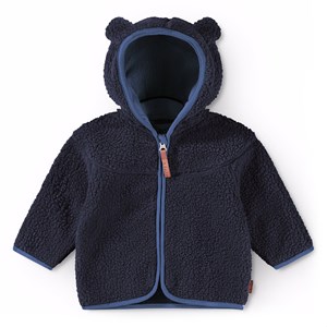 Dunkelblaue Fleecejacke für Babys und Kleinkinder. Die Jacke hat einen praktischen Reißverschluss, eine Kapuze mit kleinen Teddybärohren und hellgrünen Kanten. Die Fleecejacke ist isoliert und kann daher an kalten Tagen entweder alleine oder als zusätzliche Schicht unter Oberbekleidung getragen werden.