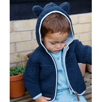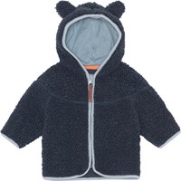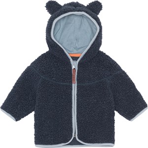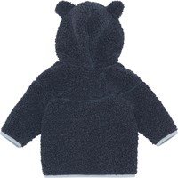 Dunkelblaue Fleecejacke für die Kleinsten mit praktischem Reißverschluss und Kapuze mit aufgestickten kleinen Ohren. Die Fleecejacke wirkt isolierend und kann daher alleine getragen werden oder als zusätzliche Schicht unter der Oberbekleidung an den kältesten Tagen.