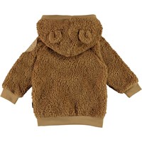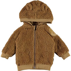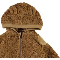 Ummi ist eine weiche Babyfleecejacke in Braun. Ummi hat eine Kapuze mit aufgesetzten kleinen Ohren, sowie Rippenbündchen am Kapuzenkante, Ärmelabschluss und Saum. Verwenden Sie ihn als Zwischenpullover oder einfach als Jacke, da er sowohl wärmend als auch isolierend wirkt.
