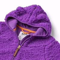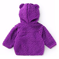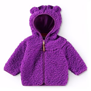 Lila Fleecejacke für Babys und Kleinkinder. Die Jacke hat einen praktischen Reißverschluss, eine Kapuze mit kleinen Teddybärohren und hellgrüne Kanten. Die Fleecejacke ist isoliert und kann daher an kalten Tagen entweder alleine oder als zusätzliche Schicht unter Oberbekleidung verwendet werden.