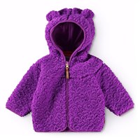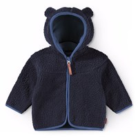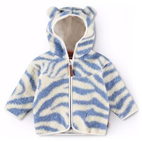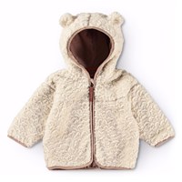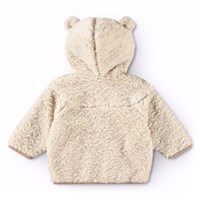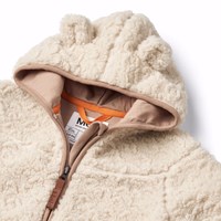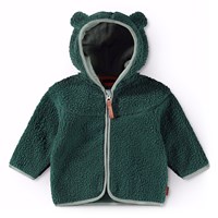 Cremefarbene Fleecejacke für Babys und Kleinkinder. Die Jacke hat einen praktischen Reißverschluss, eine Kapuze mit kleinen Teddybärohren und hellgrüne Kanten. Die Fleecejacke ist isoliert und kann daher alleine oder als zusätzliche Schicht unter Oberbekleidung an kalten Tagen verwendet werden.