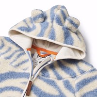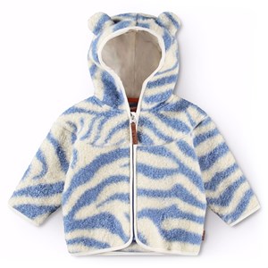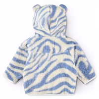 Zebra gestreifte Fleecejacke in lavendelblau für Babys und Kleinkinder. Die Jacke hat einen praktischen Reißverschluss, eine Kapuze mit kleinen Teddybärohren und hellgrüne Kanten. Die Fleecejacke ist isoliert und kann daher alleine oder als zusätzliche Schicht unter Oberbekleidung an kalten Tagen verwendet werden.