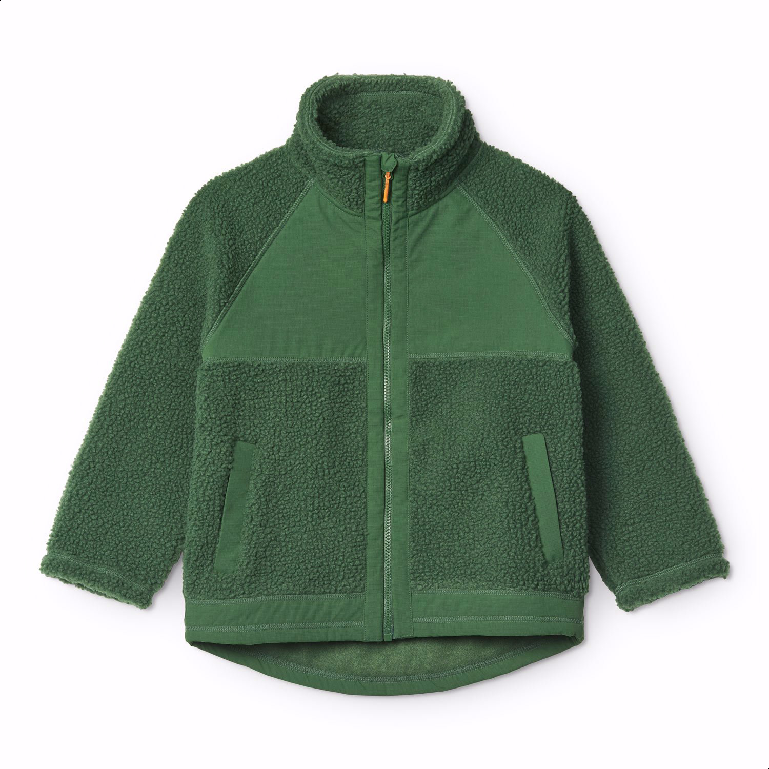 Grüne Fleecejacke aus recyceltem Polyester mit Fronttaschen und strapazierfähigen Details. Die Jacke hat eine lockere Passform, einen hohen Kragen, einen Reißverschluss mit Kinnschutz und ist hinten länger geschnitten.