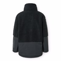 Schwarze Fleecejacke aus recyceltem Polyester mit Details an den Ärmeln, am Rücken und an den äußeren Vordertaschen, die aus wind- und wasserabweisendem strapazierfähigem Nylon gefertigt sind. Die Jacke hat einen hohen Kragen und einen Frontreißverschluss.