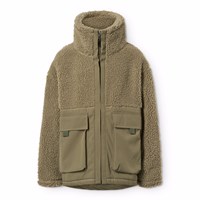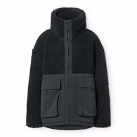 Dunkelblaue Fleecejacke aus recyceltem Polyester mit Details an den Ärmeln, am Rücken und an den äußeren Vordertaschen, die aus wind- und wasserabweisendem strapazierfähigem Nylon gefertigt sind. Die Jacke hat einen hohen Kragen und einen Frontreißverschluss.