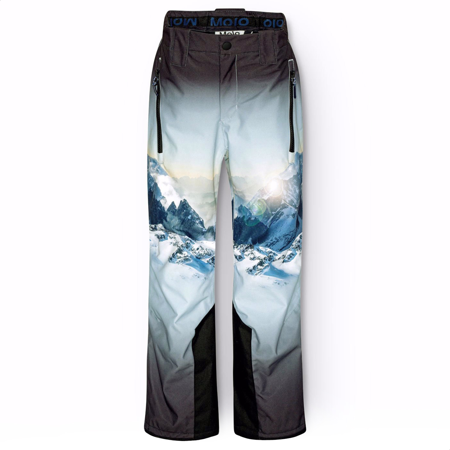 Wind- und wasserdichte Hose aus recyceltem Polyester mit einem Druck der schneebedeckten Alpen mit Sonnenstrahlen und einem klaren blauen Himmel. Die Hose hat einen Knopf- und Reißverschluss, einen verstellbaren internen Gummizug, Gürtelschlaufen für Molos-Träger (zusätzliches Zubehör) und einen verstellbaren Beinabschluss mit Schneegamaschen und zusätzlicher Verstärkung zwischen den Beinen. Die Hose verfügt über Taschen und einen großen Reflektor auf der Rückseite, um die Sichtbarkeit im Verkehr zu erhöhen. Darüber hinaus sind die Hosen in exponierten Bereichen mit Fleece gefüttert und mit 3M™ Thinsulate™ gefüttert, um eine größere Bewegungsfreiheit für das Kind zu gewährleisten.