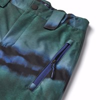 Wind- und wasserdichte Hose aus recyceltem Polyester in grün und blau mit Batikmuster. Die Hose hat einen Knopf- und Reißverschluss, einen verstellbaren internen Gummizug, Gürtelschlaufen für Molos-Träger (zusätzliches Zubehör) und einen verstellbaren Beinabschluss mit Schneegamaschen und extra Verstärkung zwischen den Beinen. Die Hose hat Taschen und einen großen Reflektor auf der Rückseite, um die Sichtbarkeit im Straßenverkehr zu erhöhen. Zusätzlich ist die Hose in den exponierten Bereichen mit Fleece gefüttert und mit 3M™ Thinsulate™ gefüttert, um eine größere Bewegungsfreiheit für das Kind zu gewährleisten.