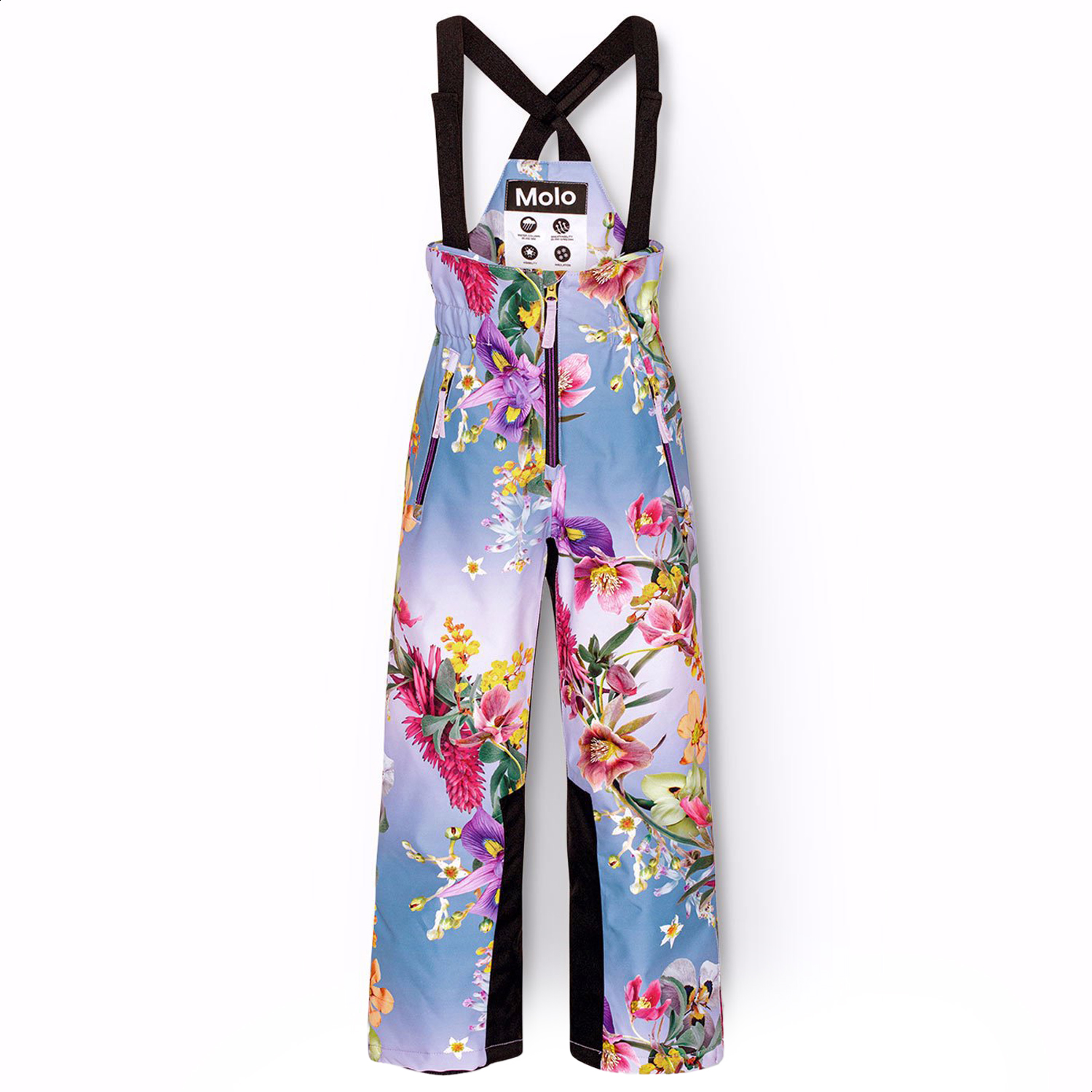 Wind- und wasserdichte Hose aus recyceltem Polyester mit einem Druck von schönen Blumen in frischen Farben auf einem blauen und lila Hintergrund. Die Hose hat einen hohen elastischen Bund, einen Reißverschluss, verstellbare Träger, verstellbare Beinöffnungen mit Schneegamaschen und zusätzliche Verstärkungen zwischen den Beinen. Die Hose hat wasserdichte Taschen und einen großen Reflektor auf der Rückseite, um die Sichtbarkeit im Verkehr zu erhöhen. Zusätzlich ist die Hose in exponierten Bereichen mit Fleece gefüttert und mit 3M™ Thinsulate™ gefüttert, was dem Kind eine größere Bewegungsfreiheit bietet.