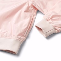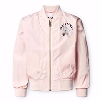 Pinkfarbene, wasserabweisende (PFC-frei: PFOS und PFOA) Bomberjacke aus recyceltem Polyester mit einem Druck auf der Rückseite und der Brust eines Pferdes und dem Text 'Pferdestärke'. Die Jacke hat eine reguläre Passform, einen Reißverschluss vorne, gerippte Kanten am Kragen, an der Taille und an den Armlöchern.