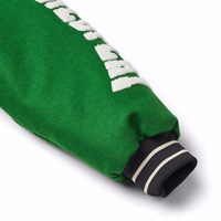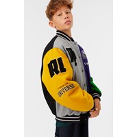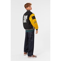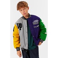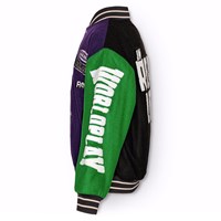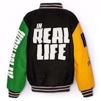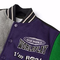 Baseballjacke in grünen, gelben, grauen und lila Farben. Die Jacke hat Druckknöpfe auf der Vorderseite, schwarze Paspeltaschen und gestreifte Rippbündchen am Hals, an den Ärmelbündchen und am Saum. Die Jacke besteht aus einer Wollmischung, die dazu beiträgt, die Temperatur zu regulieren. Die Jacke hat mehrere stilvolle Aufnäher, die die Kollektion charakterisieren, wie zum Beispiel "World Play", "In Real Life" und "I'm Real".