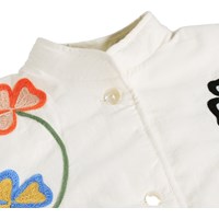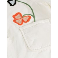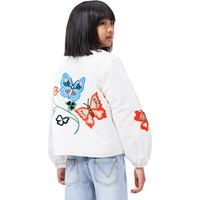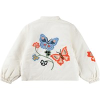 Weiße gesteppte Jacke aus weicher Baumwolle mit gestepptem Futter und bunten Blumen- und Schmetterlingsstickereien. Die Jacke hat einen Rundhalsausschnitt, Druckknöpfe vorne, Gummizug an den Ärmeln und zwei aufgesetzte Taschen. Eine warme und dekorative Jacke mit verspieltem Ausdruck – perfekt für Übergangswetter.