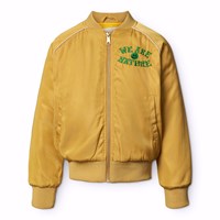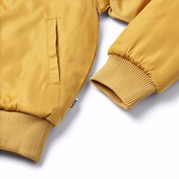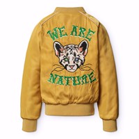 Gesteppte Bomberjacke in Gelb mit einem bestickten Rückenpatch eines Baby-Geparden und dem Text "We are Nature". Die Bomberjacke hat eine reguläre Passform, Vordertaschen, Reißverschluss und gerippte Kanten am Hals, an den Bündchen und am Saum.