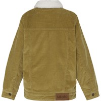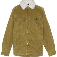 Braune Samtjacke mit Teddyfutter am Kragen. Die Jacke hat einen Knopfverschluss auf der Vorderseite sowie Außentaschen auf der Brust und Taschen an den Seiten.