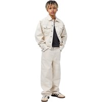 Jeansjacke in Off-White aus Baumwolle in lockerer Passform, mit Hemdkragen, Knopfverschluss vorne, Seitentaschen, Brusttaschen und verstellbaren Druckknöpfen hinten. In den Größen 92-134 wird die Jacke mit Druckknöpfen geliefert, damit Kinder die Jacke leichter selbst schließen können. In den Größen 140-176 wird die Jacke mit einem normalen Knopfverschluss geliefert.