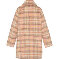 Karierter Mantel in Rosa- und Beigetönen und mit großen aufgesetzten Vordertaschen. Die Jacke hat einen Kragen und einen Knopfverschluss auf der Vorderseite.