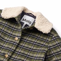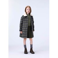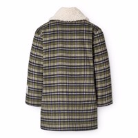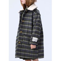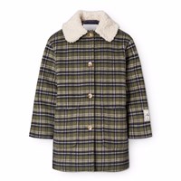Knielanger blau, grün und weiß karierte Jacke aus recyceltem Polyester und Wolle. Die Jacke hat eine lockere Passform, einen leichten Teddyfleece-Kragen, Vordertaschen und einen Knopfverschluss mit feinen braunen Knöpfen. Die Jacke hat ein gestepptes Innenfutter, das sie angenehm zu tragen macht.