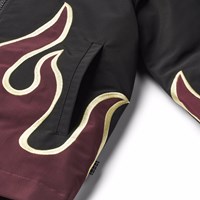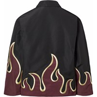 Schwarze Jacke mit bordeauxroten Flammen aus glänzendem Polyester. Die Jacke hat einen klassischen Kragen, einen Frontreißverschluss, Seitentaschen und eine lockere Passform.