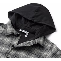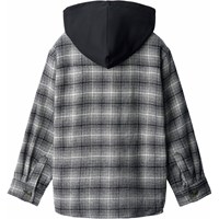 Kariertes weißes und schwarzes Overshirt aus weicher Öko-Baumwolle. Das Overshirt hat eine lockere Passform, eine schwarze Jersey-Kapuze, Knopfverschluss und lange Ärmel mit Manschetten und Knopfverschluss. Das Overshirt ist mit weichem schwarzen Jersey gefüttert, was es angenehm zu tragen macht und ideal für Übergangszeiten oder als zusätzliche Schicht an kühleren Tagen.