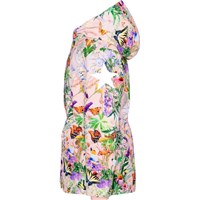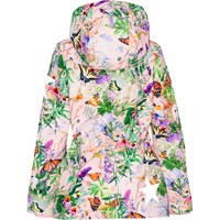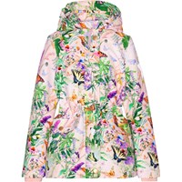 Ungefütterte, rosa Parka-Jacke aus teilweise recyceltem Polyester mit einem Allover-Print aus wilden Wildblumen und flatternden Schmetterlingen. Die Jacke verfügt über einen Frontreißverschluss mit Windleiste und Kinnschutz, große Taschen mit Klappen auf beiden Seiten, Stehkragen, abnehmbare Kapuze und sternförmige Reflektoren am Rücken und an einer Schulter. Die Jacke verfügt über einen innenliegenden, verstellbaren Gummizug in der Taille, sodass Passform und Silhouette angepasst werden können. Darüber hinaus befinden sich im Armloch eng anliegende Rippbündchen, die dafür sorgen, dass keine kalte Luft eindringt.