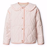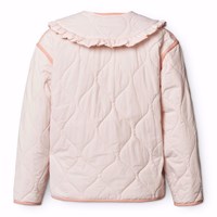 Rosa wasserabweisende Thermojacke aus recyceltem Nylon mit Steppmuster und abnehmbarem Rüschenkragen. Die Jacke hat eine reguläre Passform, Seitentaschen, Knopfverschluss vorne und passendes Kantenband für einen stilvollen Abschluss.