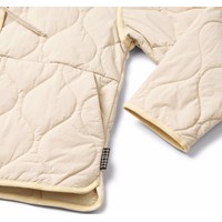 Beige, wind- und wasserabweisende wattierte Jacke aus weicher Baumwolle mit wellenförmigem Steppmuster und passendem Besatz. Die Jacke hat Druckknöpfe vorne und einen aufgenähten Kragen mit feinen Rüschendetails. Eine leichte und warme Jacke mit elegantem Erscheinungsbild.