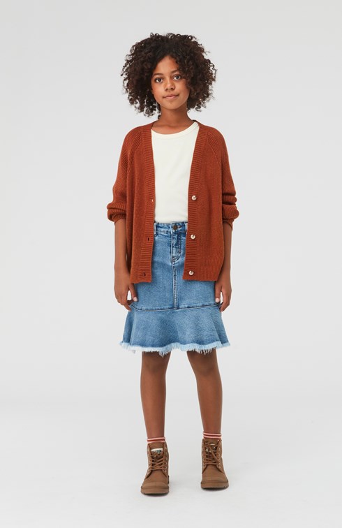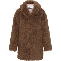 Haili ist ein weicher Teddybärmantel in Braun. Das Kragen kann sowohl hoch- als auch heruntergeklappt verwendet werden. Der Mantel hat einen Druckknopfverschluss.