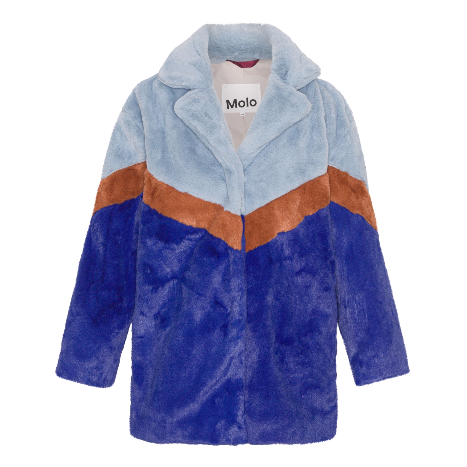 Jacke aus weichem Kunstpelz mit Kragen, Druckknöpfen und zwei Seitentaschen. Das Fell ist zweifarbig in Dunkelblau oben, Hellblau unten, und ein brauner Streifen über der Brust.