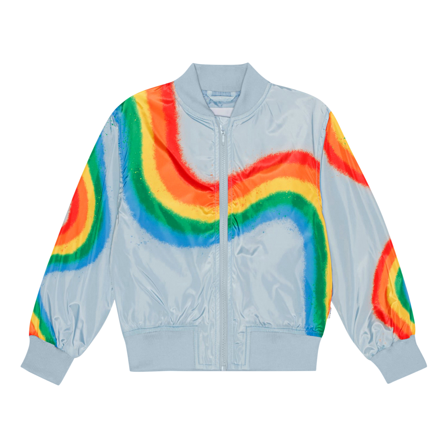 Hellblaue, wasserabweisende Bomberjacke aus 100% recyceltem Polyester mit einem wellenförmigen Regenbogenaufdruck auf der Vorderseite, den Ärmeln und dem Rücken. Die Jacke hat elastische Rippbündchen am Kragen, an der Hüfte und an den Armlöchern. Es wurde eine wasser- und schmutzabweisende Beschichtung verwendet, ohne den Einsatz von Chemikalien wie PFOS, PFOA und dergleichen.