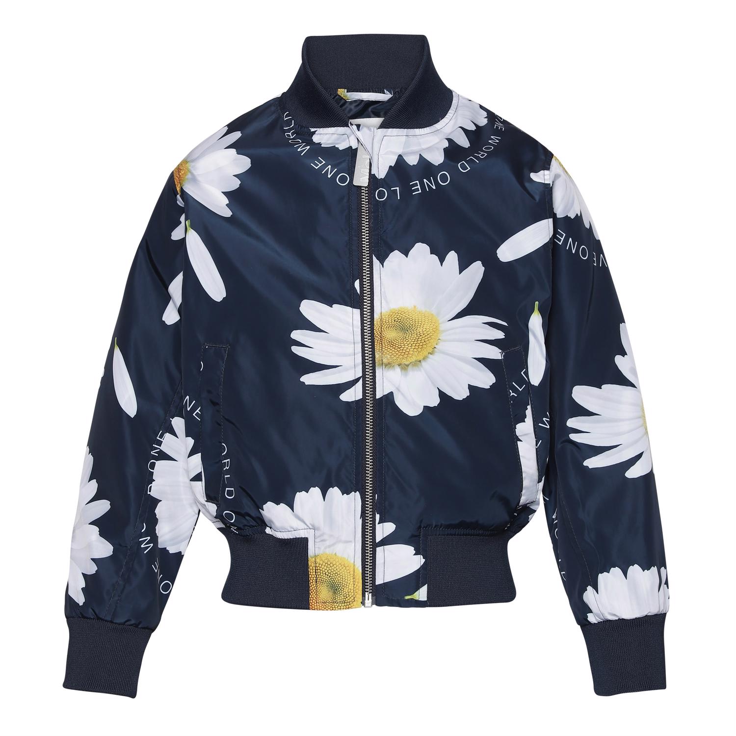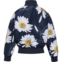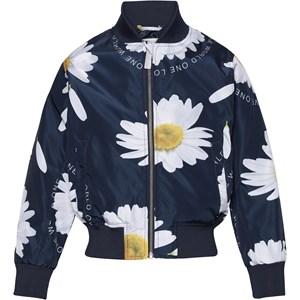 Haliva ist eine sportliche Bomberjacke in Dunkelblau mit Druck großer Margeriten. Haliva hat Seitentaschen und einen Rippkante am Hals, unten und am Ärmelende.