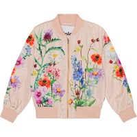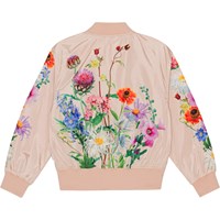 Rosafarbene, wasserabweisende Bomberjacke aus 100% recyceltem Polyester mit einem Aufdruck aus Wildblumen auf der Vorderseite, den Ärmeln und dem Rücken. Die Jacke hat elastische Rippbündchen am Kragen, an der Hüfte und an den Armlöchern. Es wurde eine wasser- und schmutzabweisende Beschichtung verwendet, ohne den Einsatz von Chemikalien wie PFOS, PFOA und dergleichen.