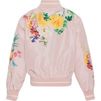 Haliva ist eine rosafarbene Bomberjacke mit einem wunderschönen Druck aus exotischen Blumen, Tieren und Früchten. Haliva hat gestreifte Ripp an Hals, Handgelenken und Hüften.